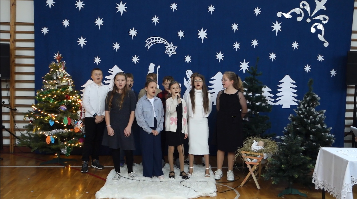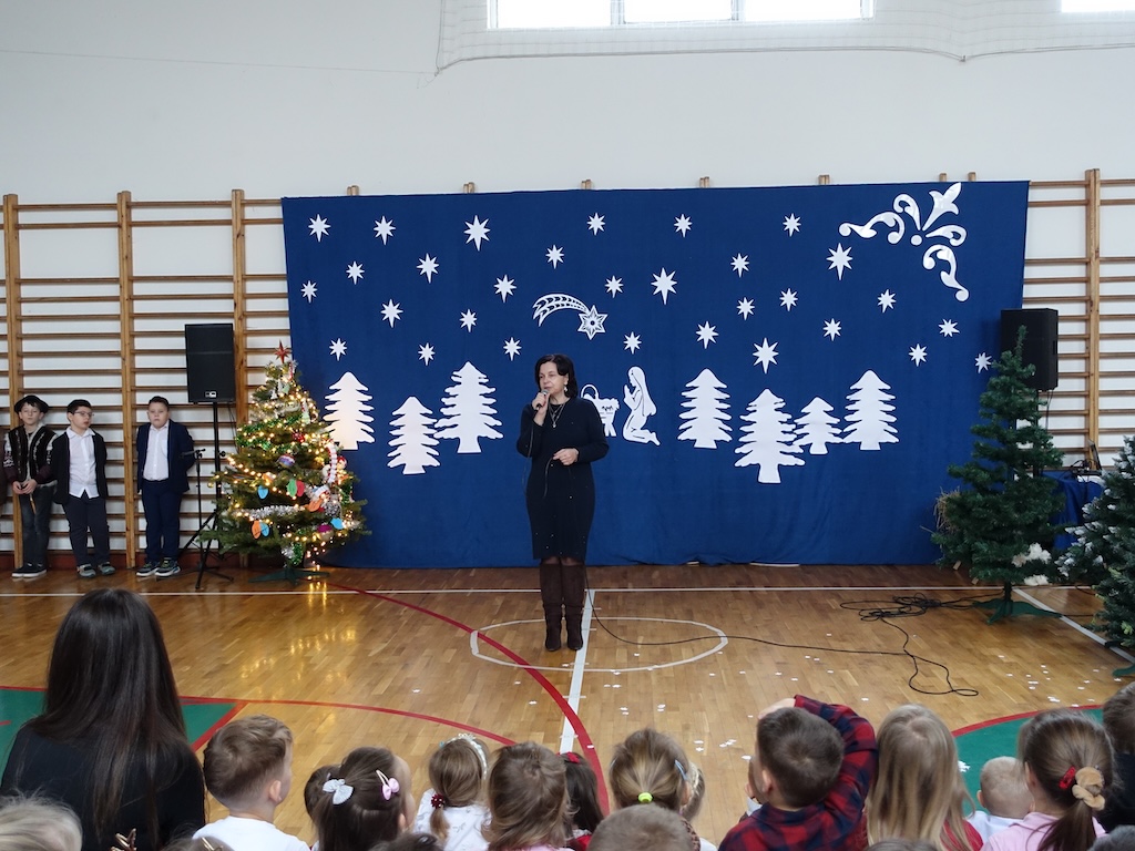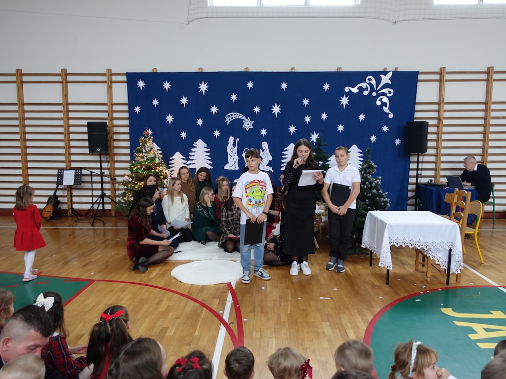 Kolejnym punktem dnia było wspólne kolędowanie. Każda klasa zaprezentowała wybraną kolędę lub pastorałkę, tworząc niezwykle radosną i wzruszającą atmosferę. Śpiew połączył całą społeczność szkolną i przypomniał o tym, co w Świętach najważniejsze – bliskości, życzliwości i wspólnocie.