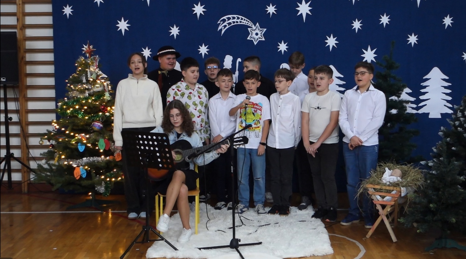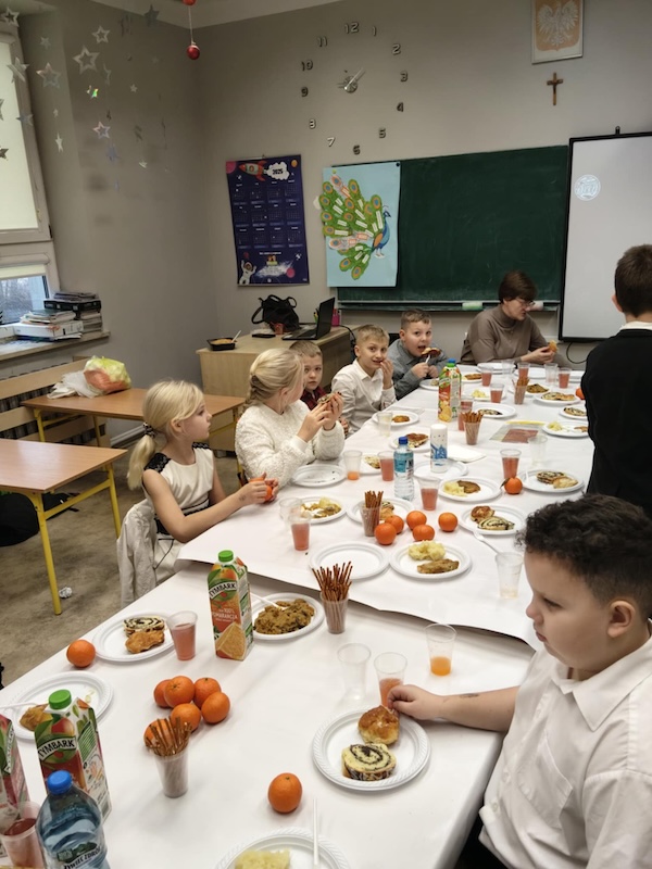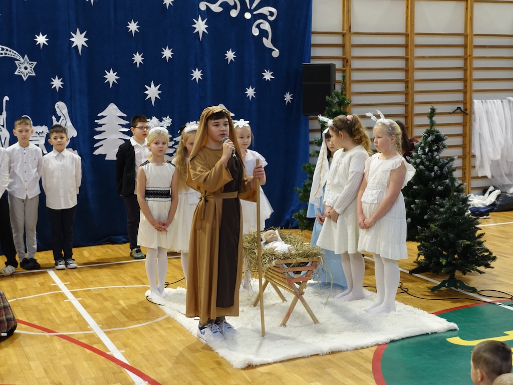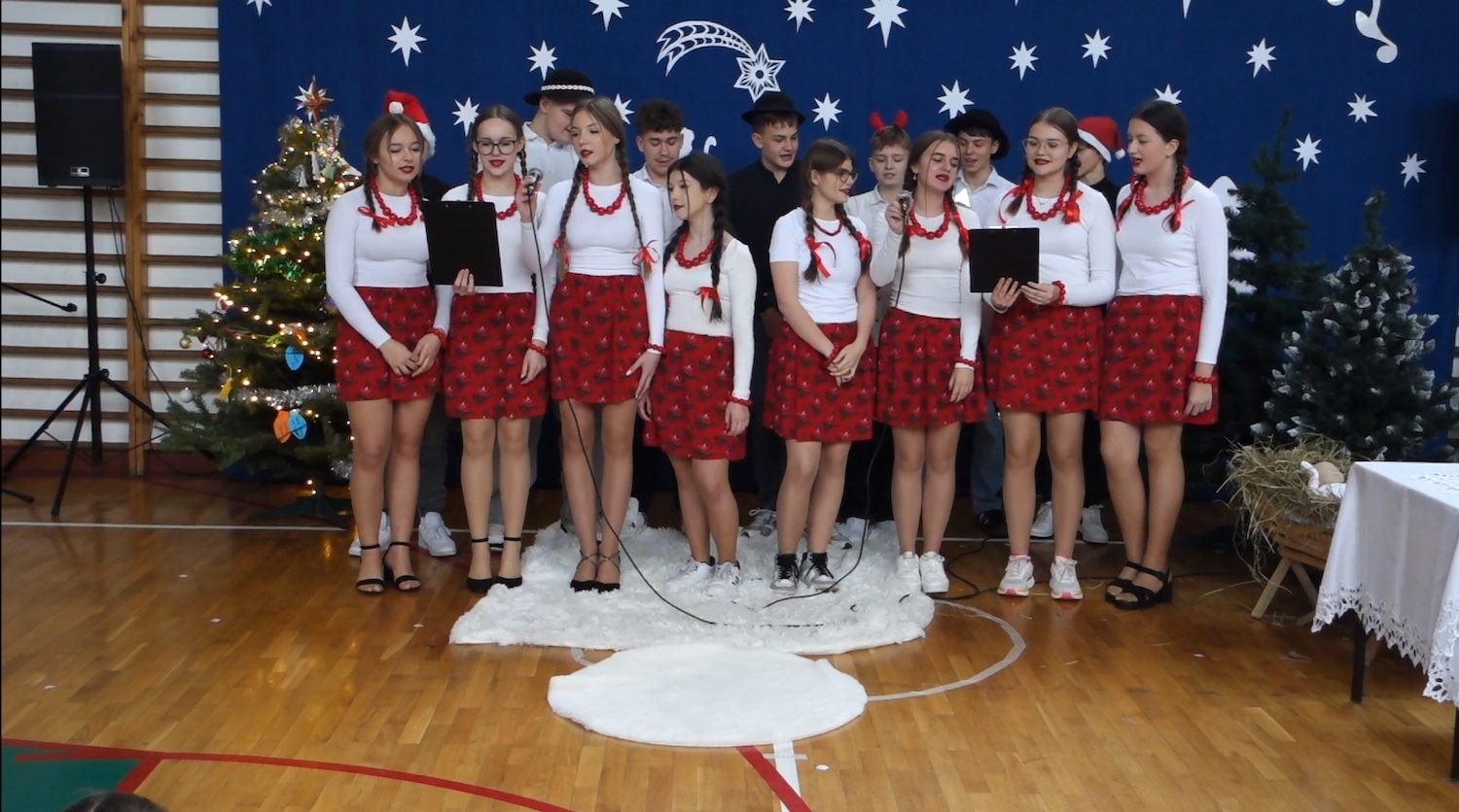 Kolejnym punktem dnia było wspólne kolędowanie. Każda klasa zaprezentowała wybraną kolędę lub pastorałkę, tworząc niezwykle radosną i wzruszającą atmosferę. Śpiew połączył całą społeczność szkolną i przypomniał o tym, co w Świętach najważniejsze – bliskości, życzliwości i wspólnocie.