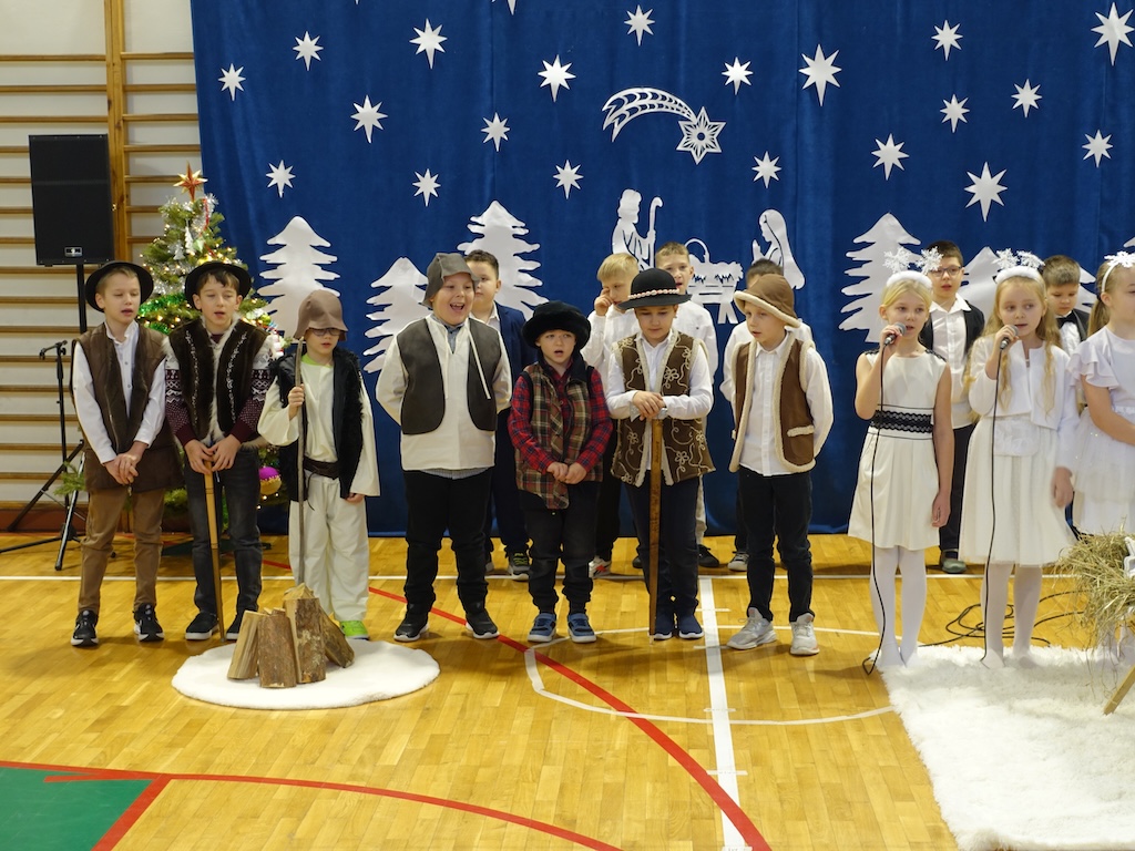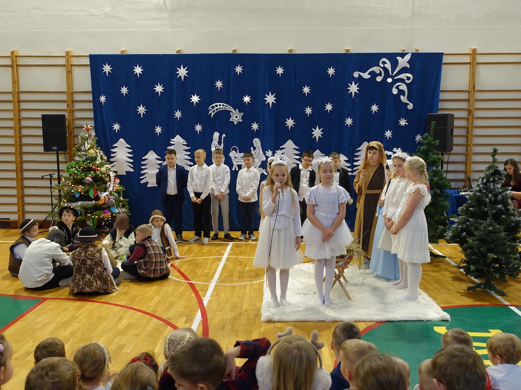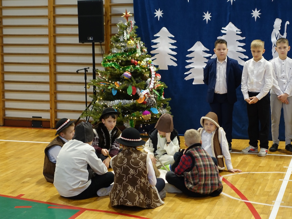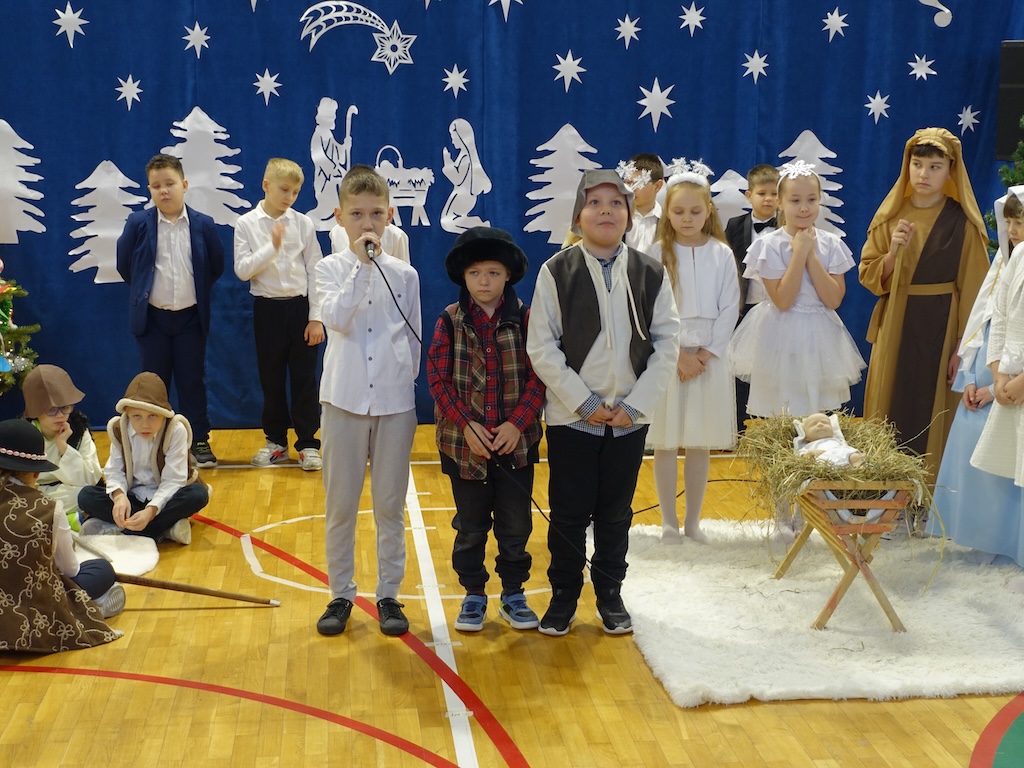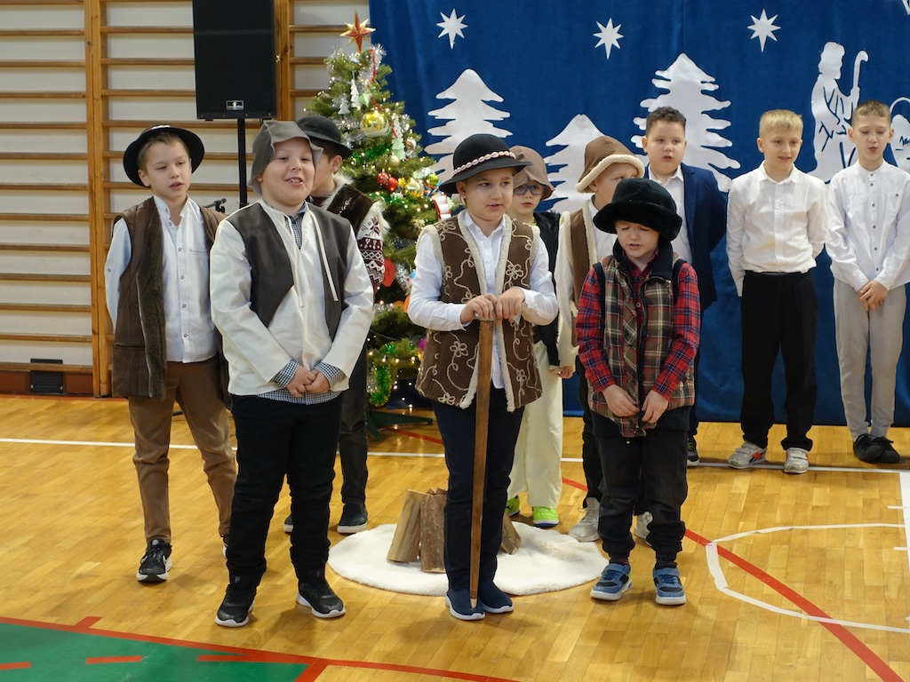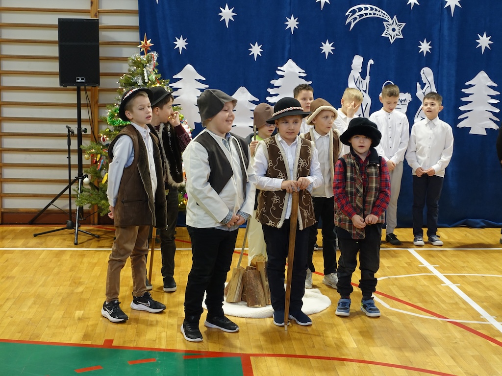 Uroczystość rozpoczęliśmy występem uczniów klas II i III, którzy wprowadzili wszystkich w świąteczny nastrój poprzez przygotowany program artystyczny. Ich zaangażowanie, radość i piękne stroje zostały nagrodzone gromkimi brawami.