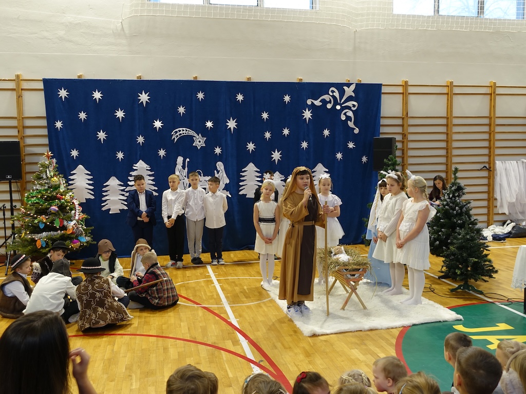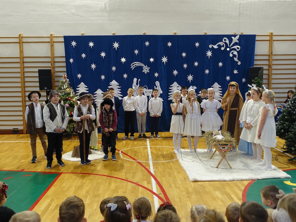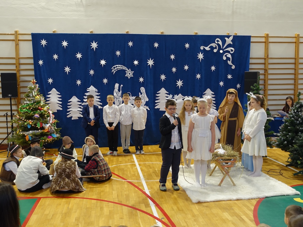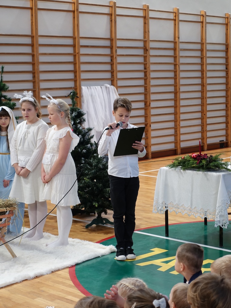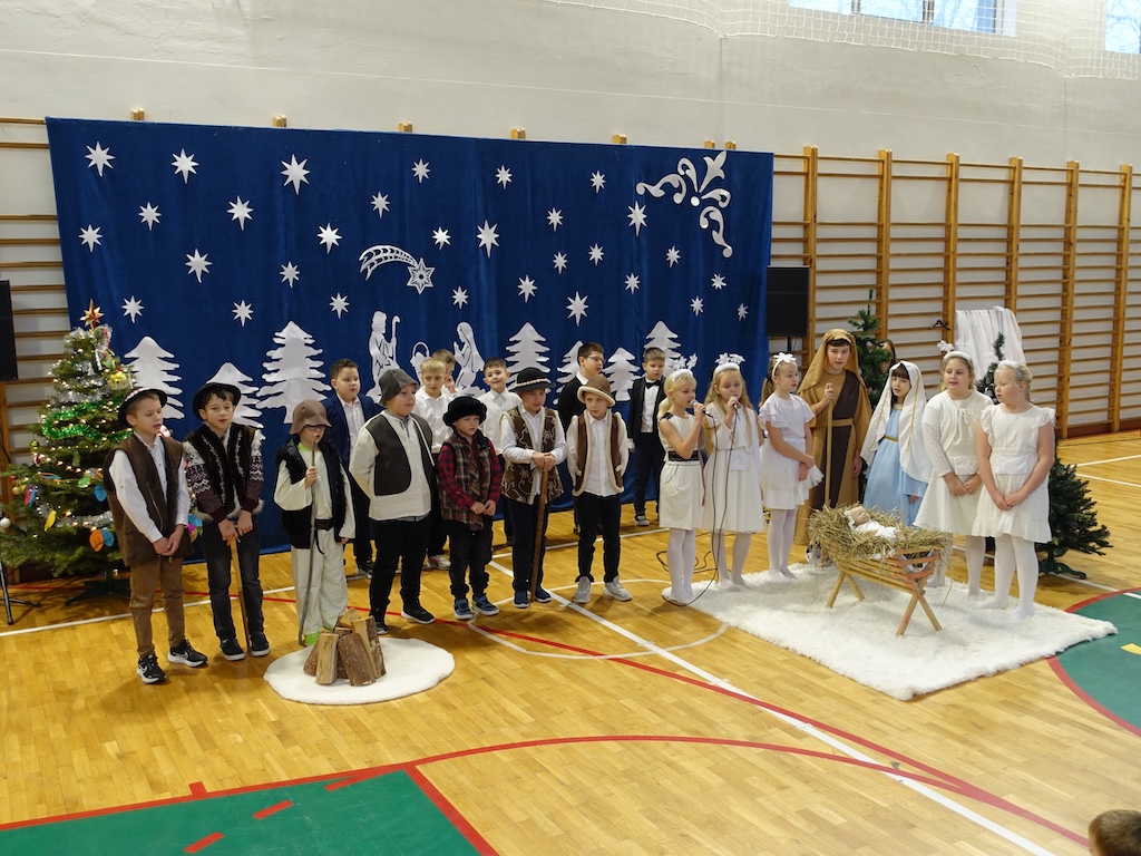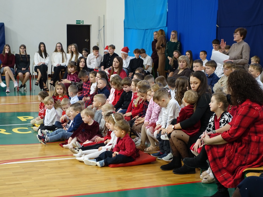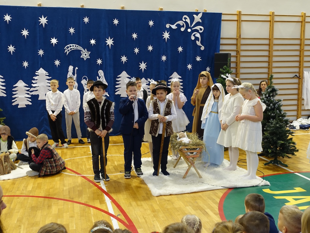 Uroczystość rozpoczęliśmy występem uczniów klas II i III, którzy wprowadzili wszystkich w świąteczny nastrój poprzez przygotowany program artystyczny. Ich zaangażowanie, radość i piękne stroje zostały nagrodzone gromkimi brawami.