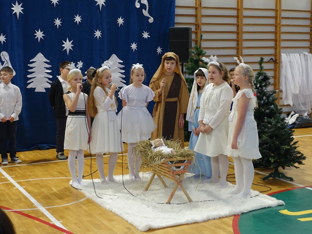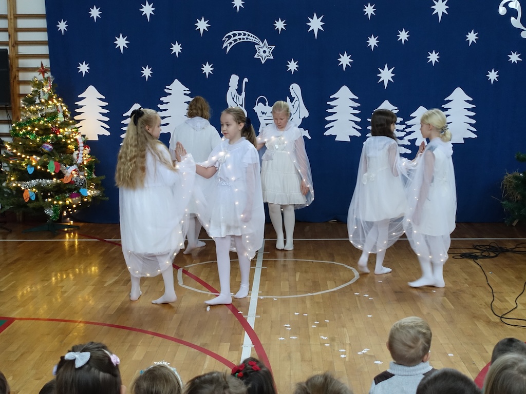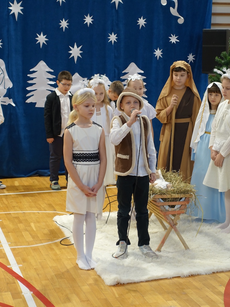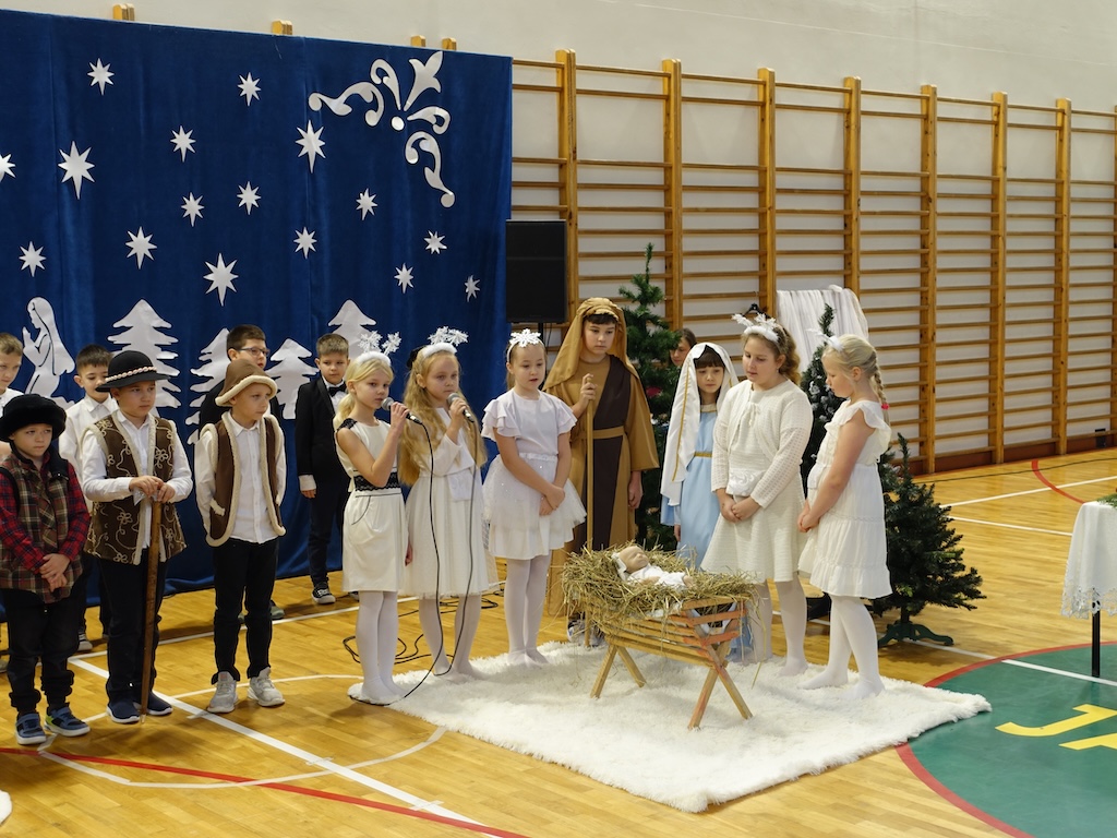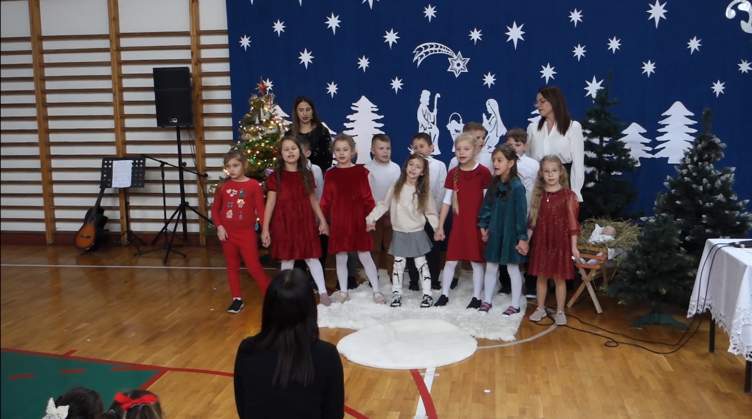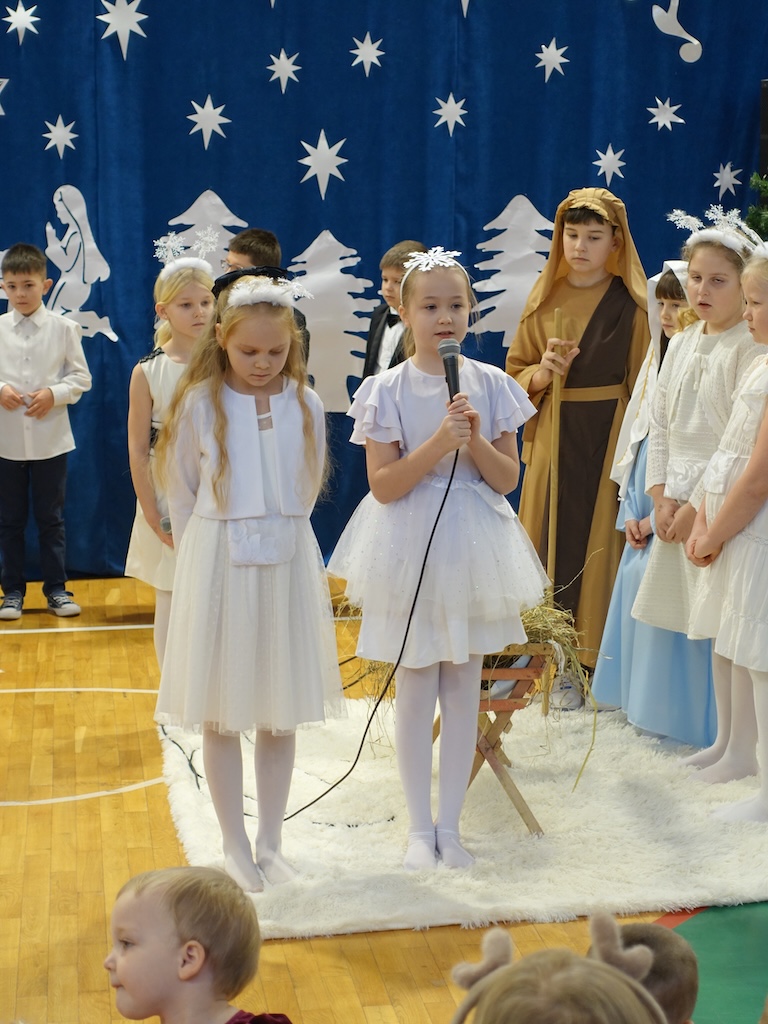 Uroczystość rozpoczęliśmy występem uczniów klas II i III, którzy wprowadzili wszystkich w świąteczny nastrój poprzez przygotowany program artystyczny. Ich zaangażowanie, radość i piękne stroje zostały nagrodzone gromkimi brawami.
