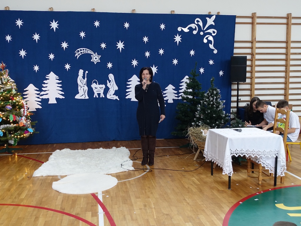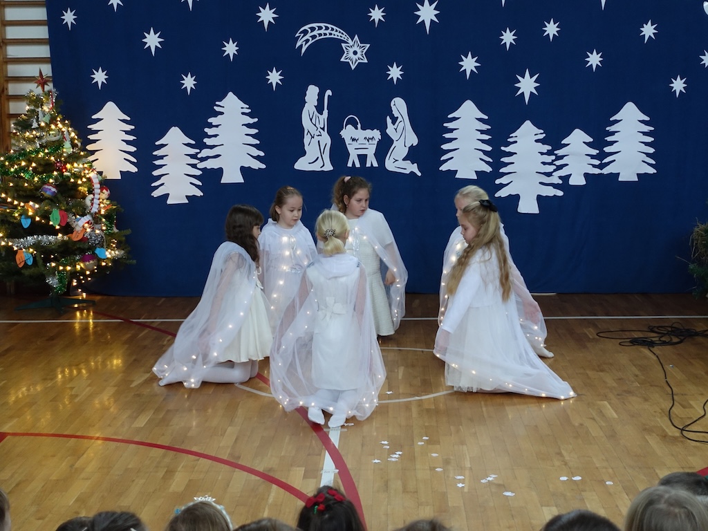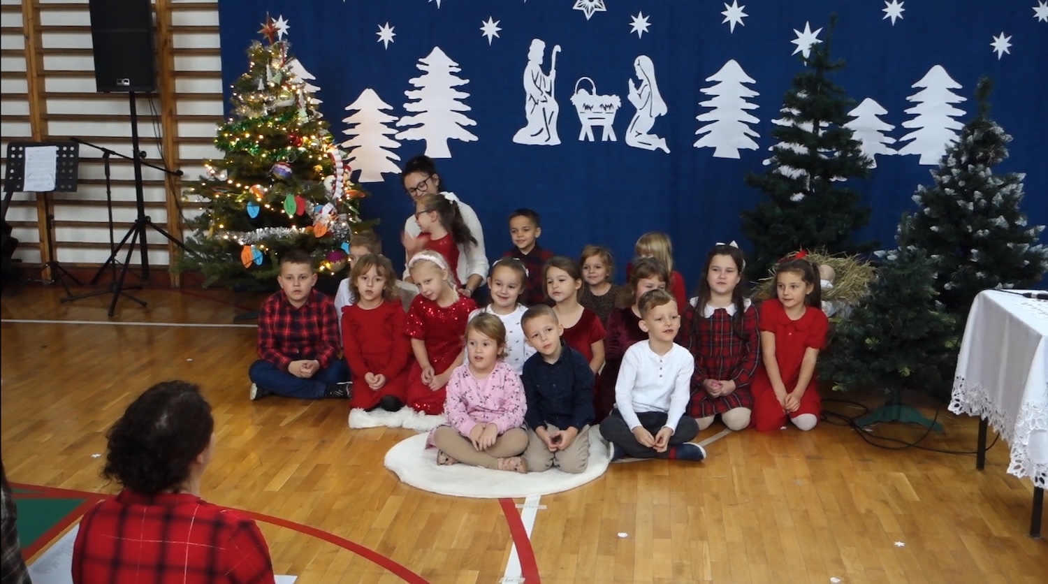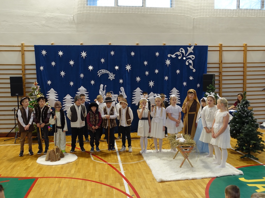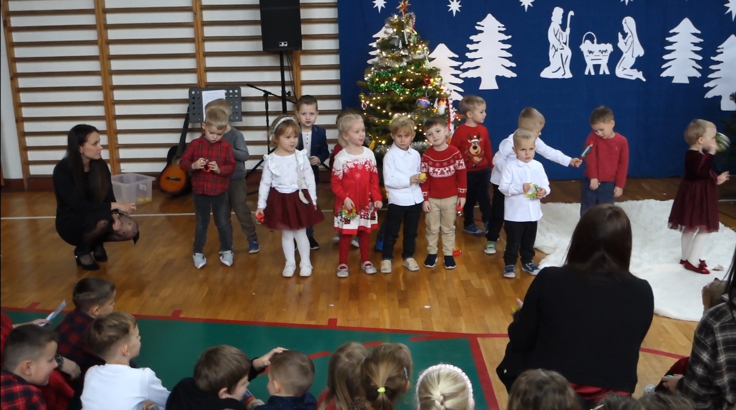 Uroczystość rozpoczęliśmy występem uczniów klas II i III, którzy wprowadzili wszystkich w świąteczny nastrój poprzez przygotowany program artystyczny. Ich zaangażowanie, radość i piękne stroje zostały nagrodzone gromkimi brawami.