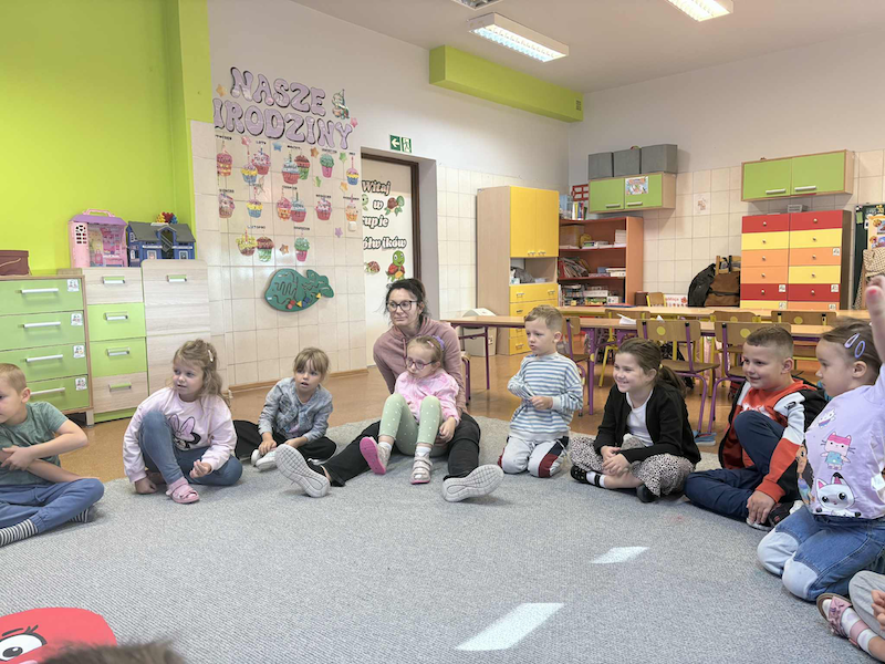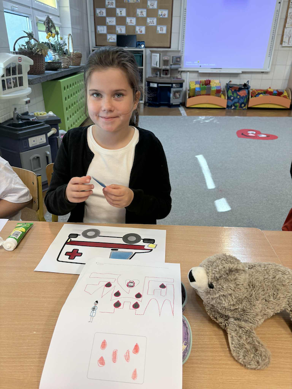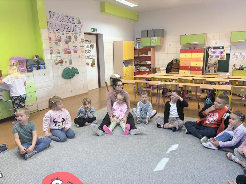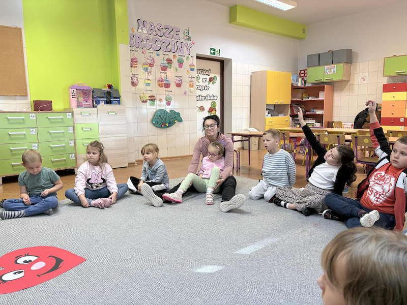 Podczas spotkania pani Hania przeczytała dzieciom wybrane fragmenty książki Wojciecha Grajkowskiego pt. „Krew”. Przedszkolaki z dużym zainteresowaniem słuchały opowieści, a następnie chętnie odpowiadały na pytania dotyczące treści. Rozmawiały o tym, czym jest krew, jaką pełni funkcję w naszym ciele, dlaczego jest tak ważna dla zdrowia człowieka oraz czy można ją kupić w sklepie. Dzieci wykazały się dużą ciekawością i aktywnie uczestniczyły w dyskusji, dzieląc się swoimi przemyśleniami i spostrzeżeniami.