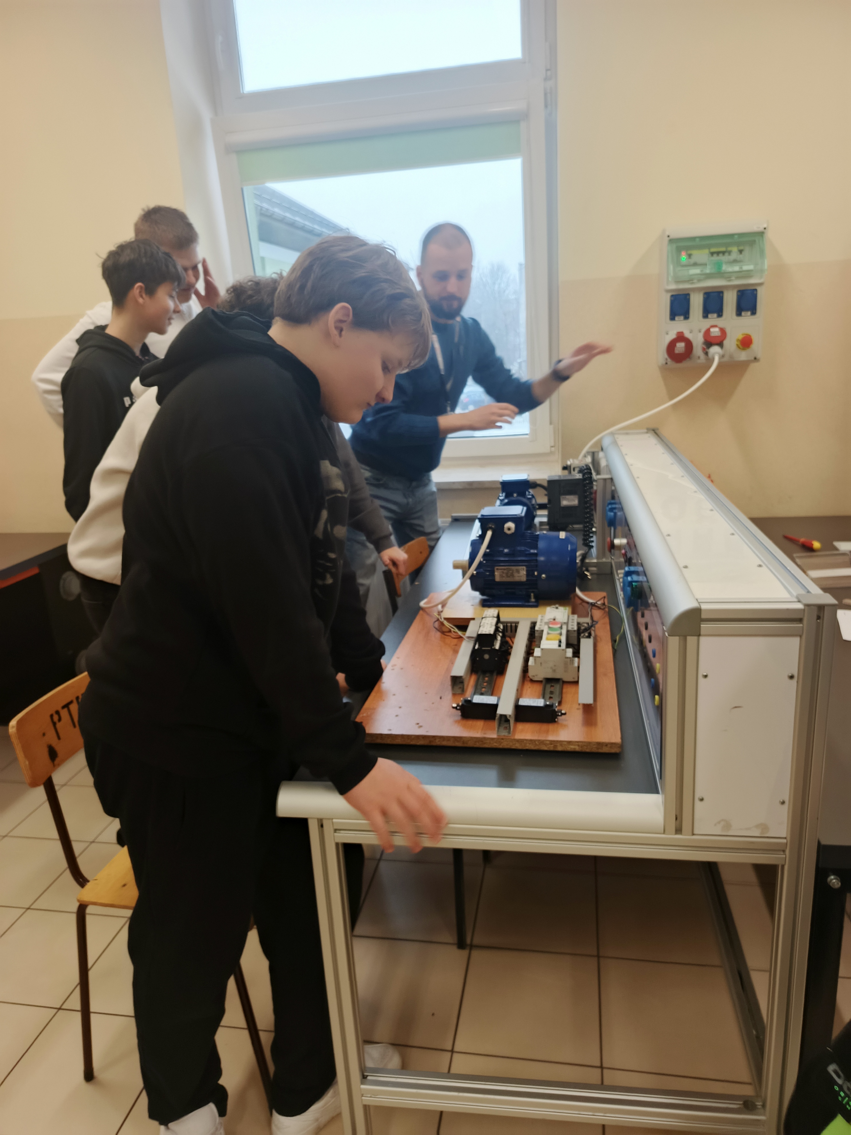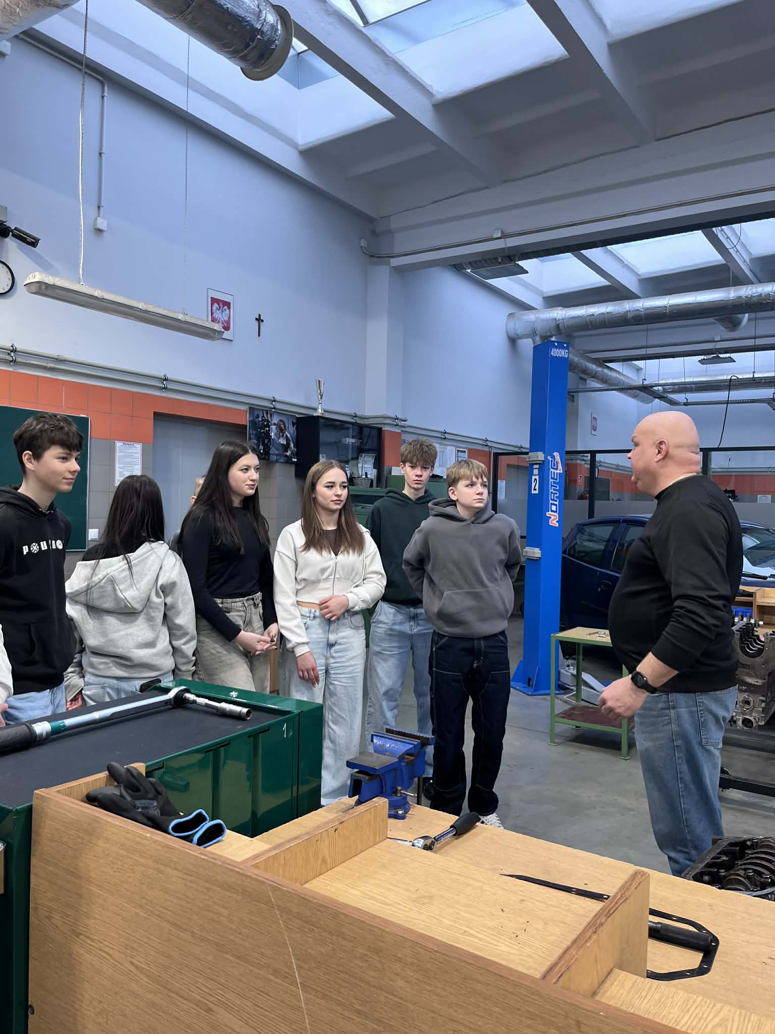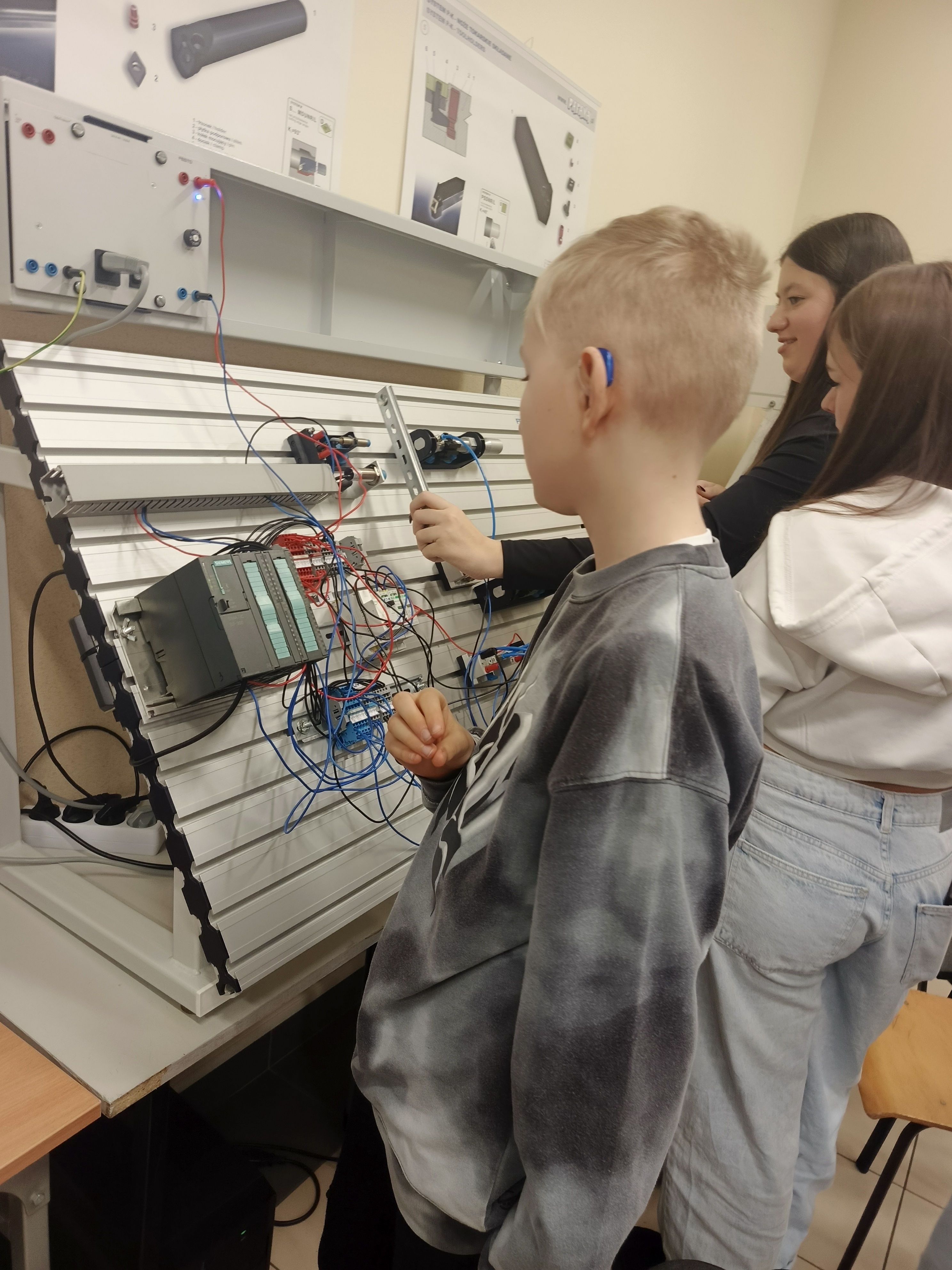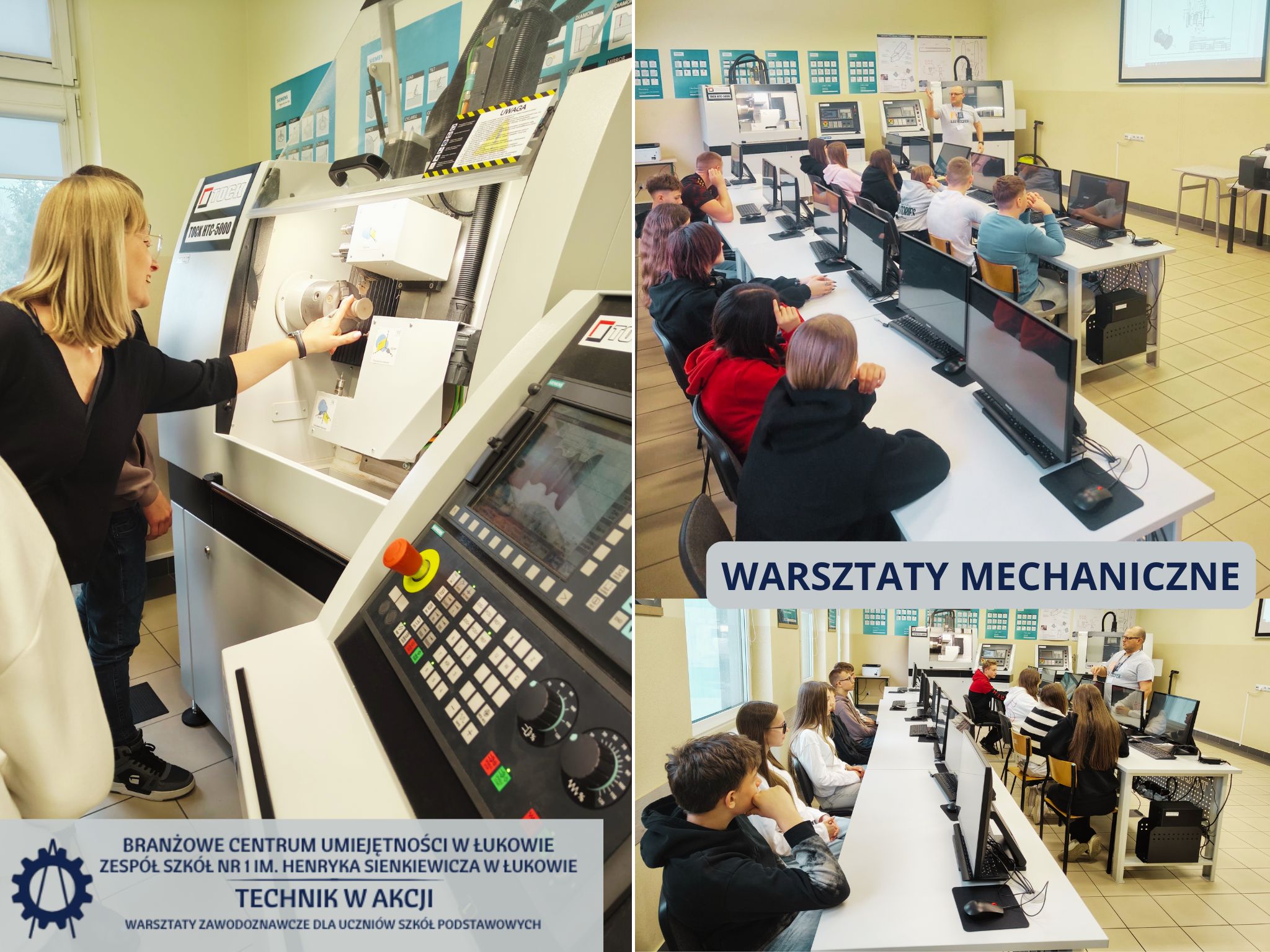 Kolejnym elementem programu były praktyczne warsztaty, które stały się dla uczniów okazją do bezpośredniego kontaktu z nowoczesną techniką i realiami pracy zawodowej. Zajęcia odbywały się w nowoczesnych pracowniach Zespołu Szkół Nr 1 w Łukowie oraz w laboratoriach Branżowego Centrum Umiejętności. Uczniowie poznawali różnorodne obszary kształcenia technicznego — od mechaniki maszyn i obróbki CNC, przez motoryzację i elektrykę, po informatykę, programowanie, mechatronikę i ekonomię. Zajęcia pokazywały, że współczesne technologie nie funkcjonują w izolacji, lecz tworzą sieć wzajemnie powiązanych dziedzin. Dzięki temu uczestnicy mogli zobaczyć, jak rozwiązania mechaniczne, elektryczne i informatyczne przenikają się, tworząc nowoczesne systemy wykorzystywane w przemyśle.